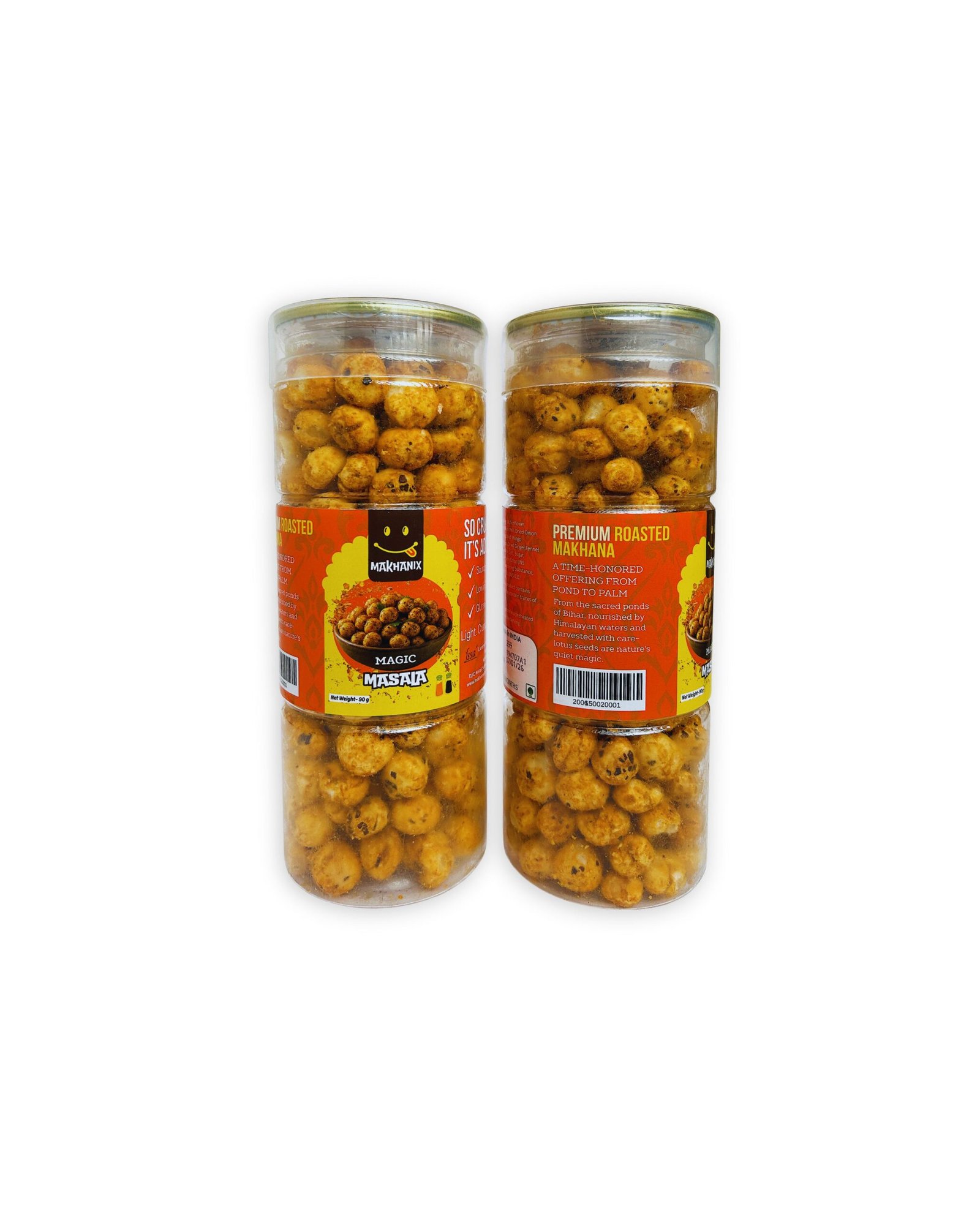 Experience the classic taste of Indian spices with Magic Masala Makhana, a perfectly roasted snack crafted for lovers of desi flavours. Made from carefully selected lotus seeds sourced from Bihar, this makhana is roasted—not fried—to deliver a light, airy crunch with every bite.