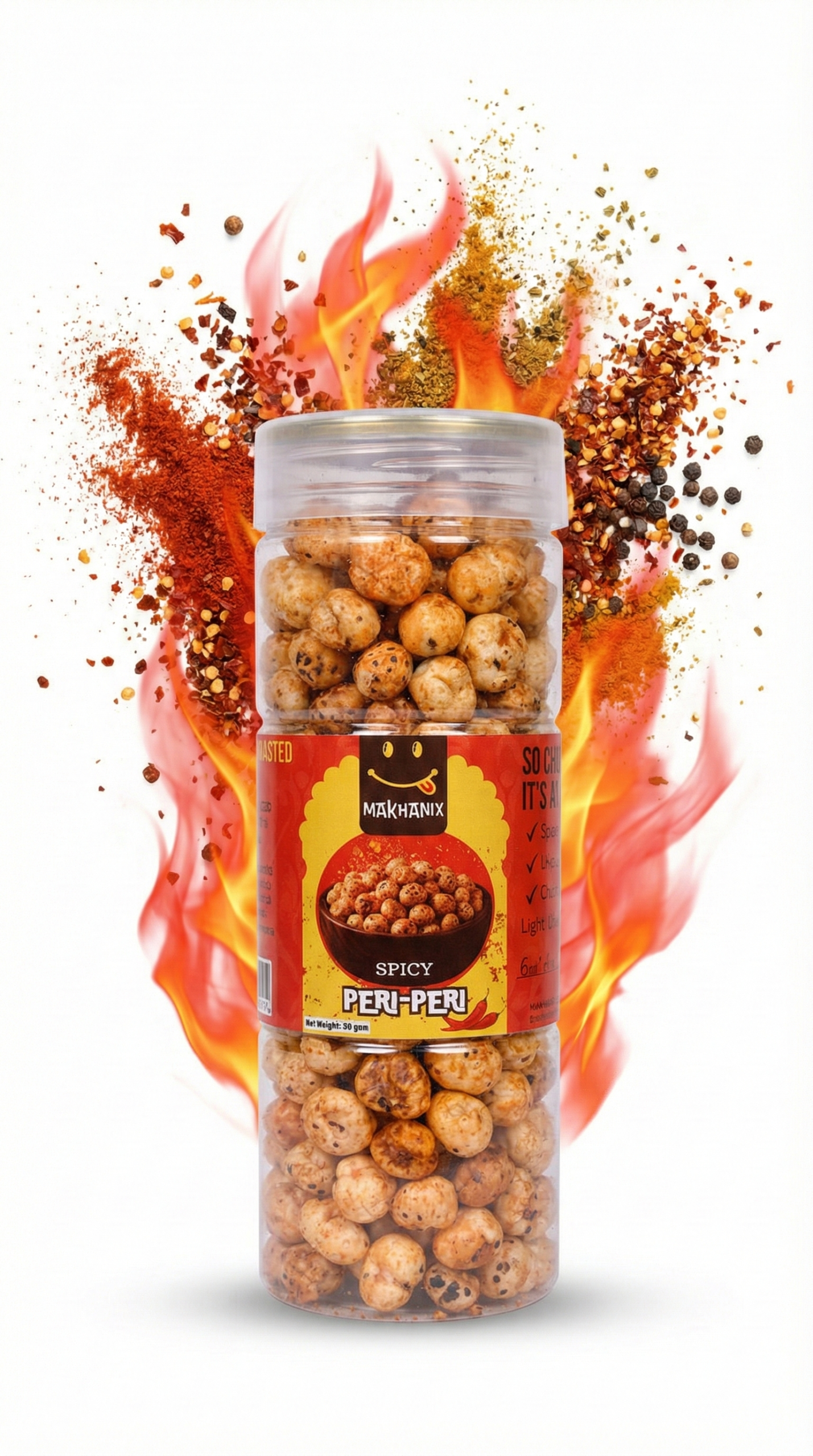 Makhanix Peri Peri Makhana is a bold and spicy snack made from premium roasted fox nuts, seasoned with fiery peri peri flavours. Light, crunchy, gluten-free and low in calories, it’s a guilt-free alternative to fried snacks, proudly made in India.